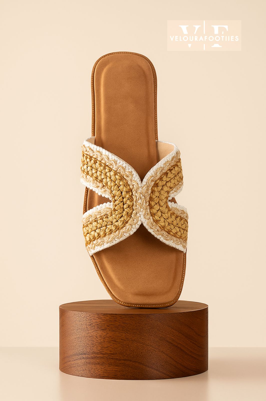 Step into effortless style and comfort with these beautifully handcrafted woven slide sandals. Designed with a unique crisscross braided strap in natural tones, they bring together boho charm and modern elegance. The cushioned footbed ensures all-day comfort, while the open-toe silhouette keeps your look fresh and breezy.