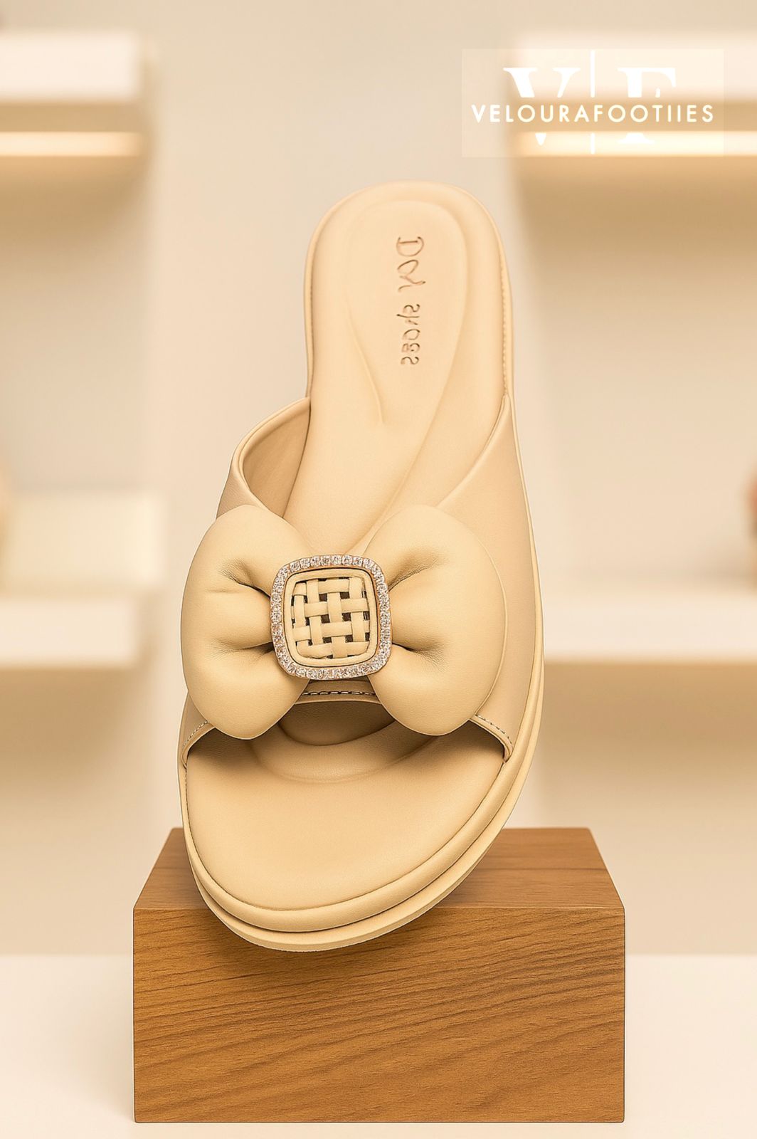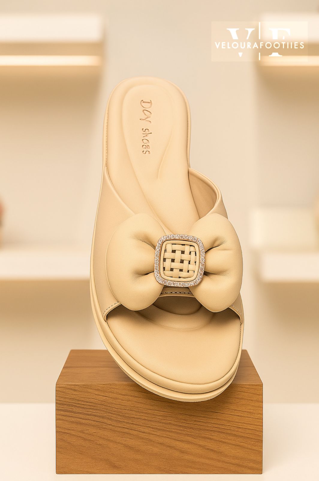 Add a touch of charm and comfort to your look with our Bow Accent Slide Sandals. Designed with a soft cushioned sole and a statement bow detail, these slip-ons blend feminine elegance with everyday wearability. The rhinestone-embellished buckle adds a subtle sparkle, making them perfect for both casual days and dressier occasions.